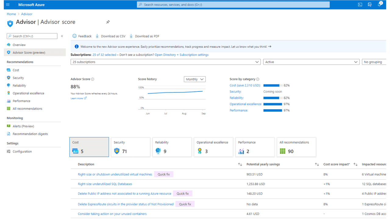 Understand how well your workloads are following Azure best practices, assess how much you stand to gain by remediating issues, and prioritize the most impactful recommendations you can take to optimize your deployments with the new Azure Advisor score. Advisor score enables you to get the most out of your Azure investment using a centralized dashboard to monitor, work on, and track your progress toward optimizing the cost, security, reliability, operational excellence, and performance of your Azure resources.