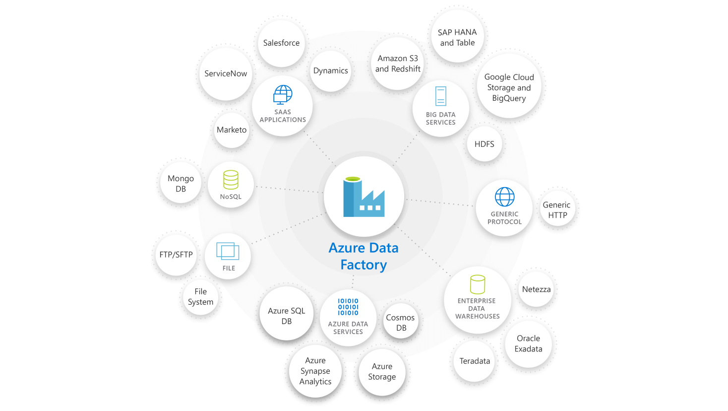 - Choose from more than 90 built-in connectors to acquire data from Big Data sources like Amazon Redshift, Google BigQuery, HDFS; enterprise data warehouses like Oracle Exadata, Teradata; SaaS apps like Salesforce, Marketo, and ServiceNow; and all Azure data services.