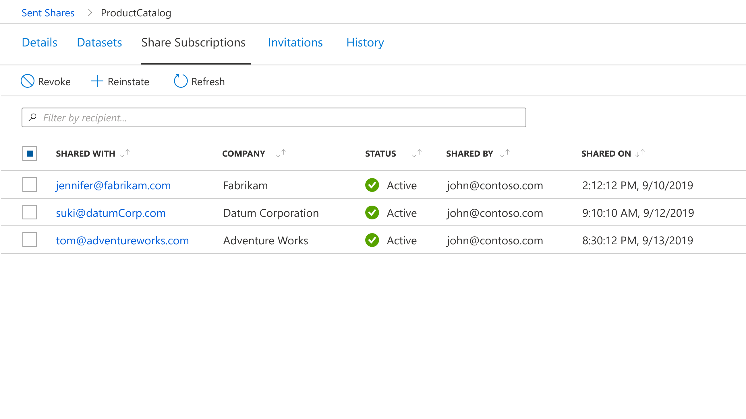 Share structured and unstructured data from multiple Azure data stores with other organizations in just a few clicks. There’s no infrastructure to set up or manage, no SAS keys are required, and sharing is all code-free. You control data access and set terms of use aligned with your enterprise policies. Use snapshot-based sharing to copy data from the data provider, or use in-place sharing to refer to data in the provider’s account.