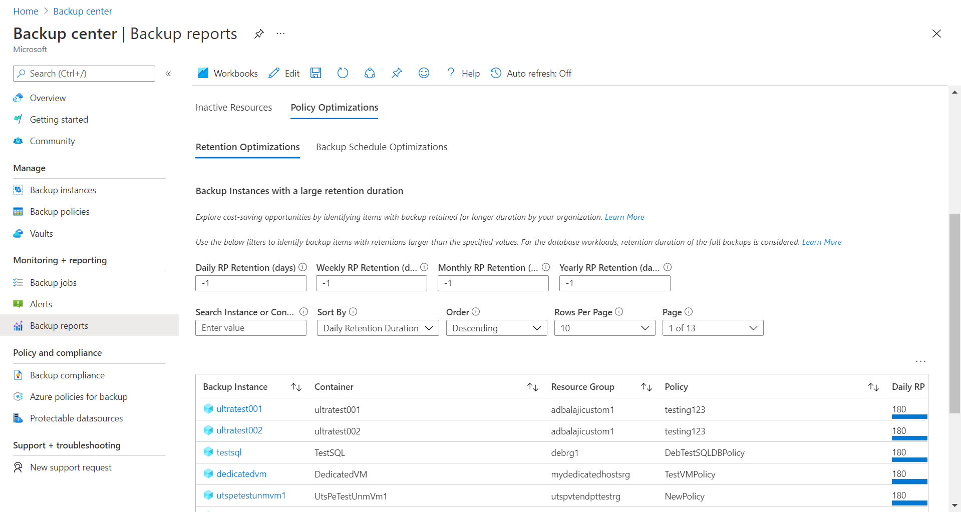 • Optimize backup cost with patterns and insights under Backup reports to right-size your backup storage.