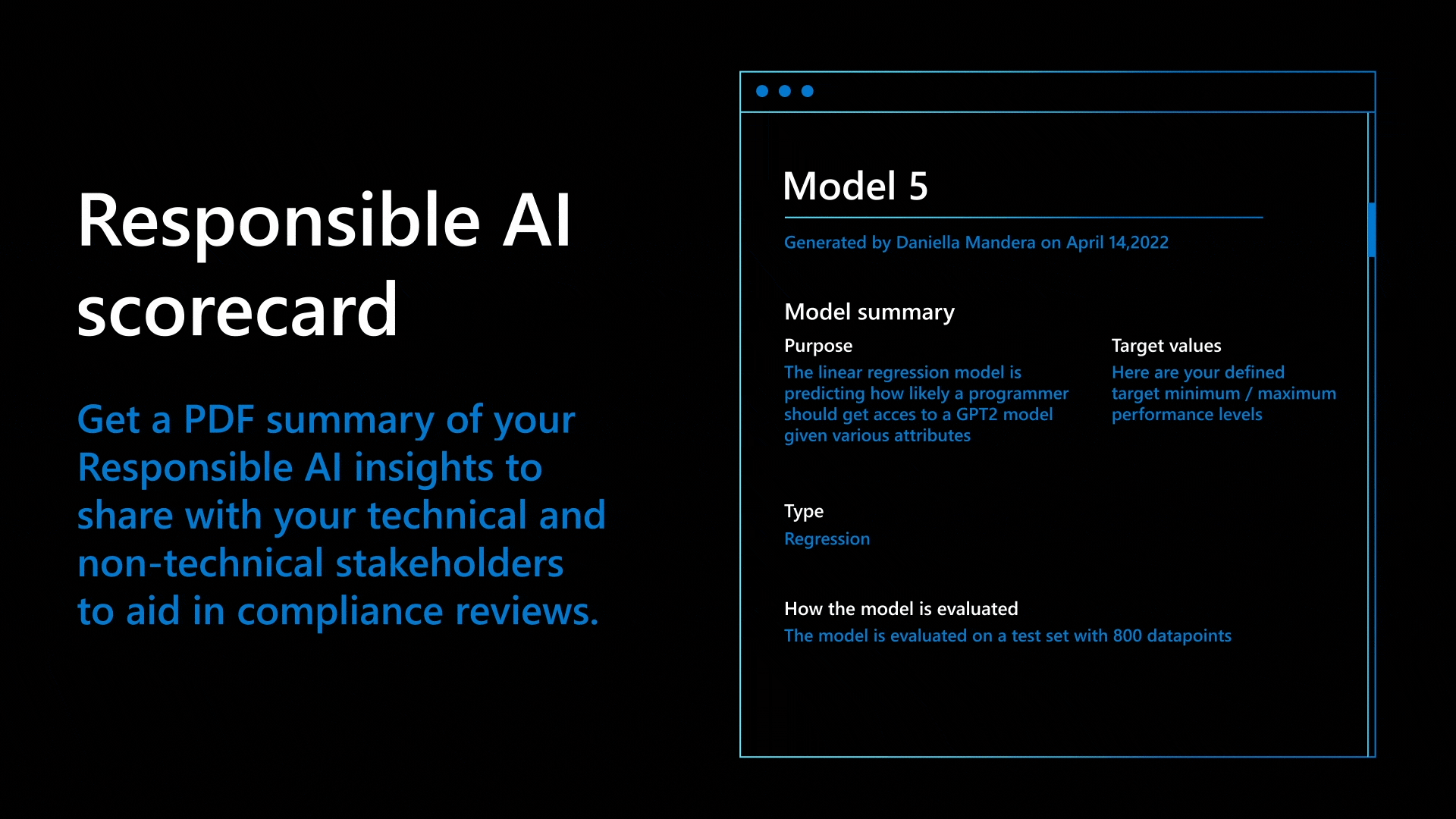Protect and govern your machine learning assets with enterprise privacy and security controls, 60+ compliance certifications, and machine learning operations (MLOps). Easily track and understand data lineage and use the connector for Microsoft Purview to streamline metadata storage and perform faster root cause analyses. Export responsible AI scorecards (preview) for your machine learning models to contextualize responsible AI metrics for business stakeholders and foster proactive collaboration.