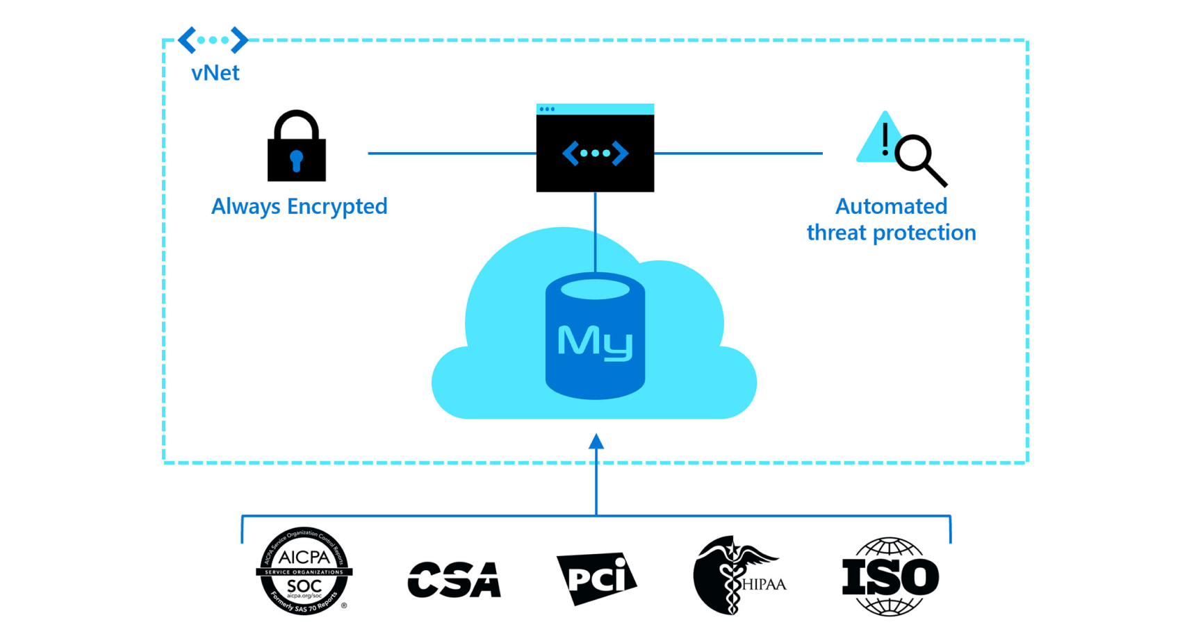 • Get industry-leading Azure compliance, including HIPAA, PCI DSS, FedRAMP, and ISO, built in.