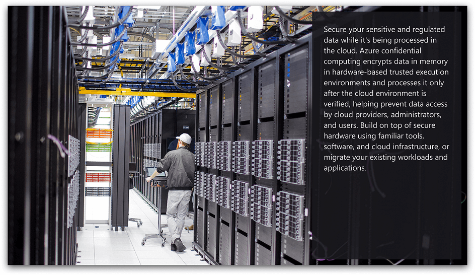 Secure your sensitive and regulated data while it's being processed in the cloud. Azure confidential computing encrypts data in memory in hardware-based trusted execution environments and processes it only after the cloud environment is verified, helping prevent data access by cloud providers, administrators, and users. Build on top of secure hardware using familiar tools, software, and cloud infrastructure, or migrate your existing workloads and applications.